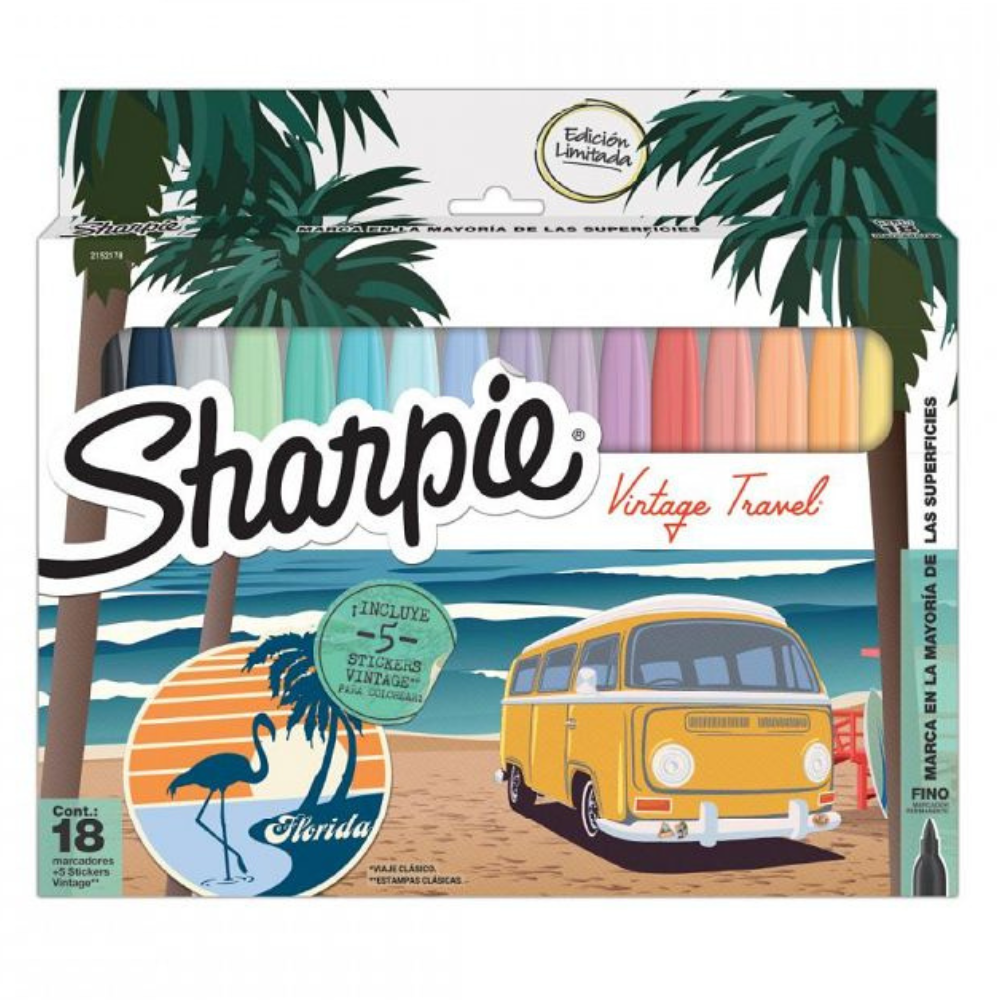 Este set de edición limitada incluye 18 marcadores Sharpie de punta fina, ideales para una variedad de superficies gracias a su tinta permanente que no se decolora, seca rápidamente y es resistente al agua.
