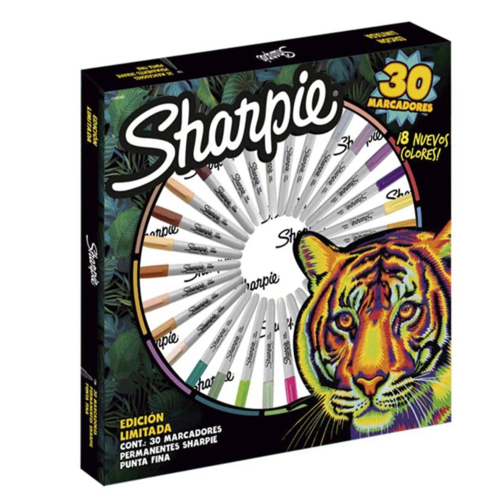 Este set incluye 30 marcadores Sharpie de punta fina, ideales para una variedad de superficies gracias a su tinta permanente que no se decolora, seca rápidamente y es resistente al agua.