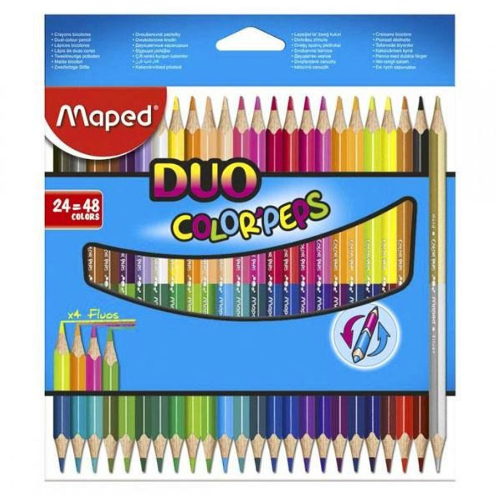- 24 lápices de colores DÚO = 48 LÁPICES DÚO (INCLUYE DORADO, PLATEADO Y 4 COLORES FLUOS)