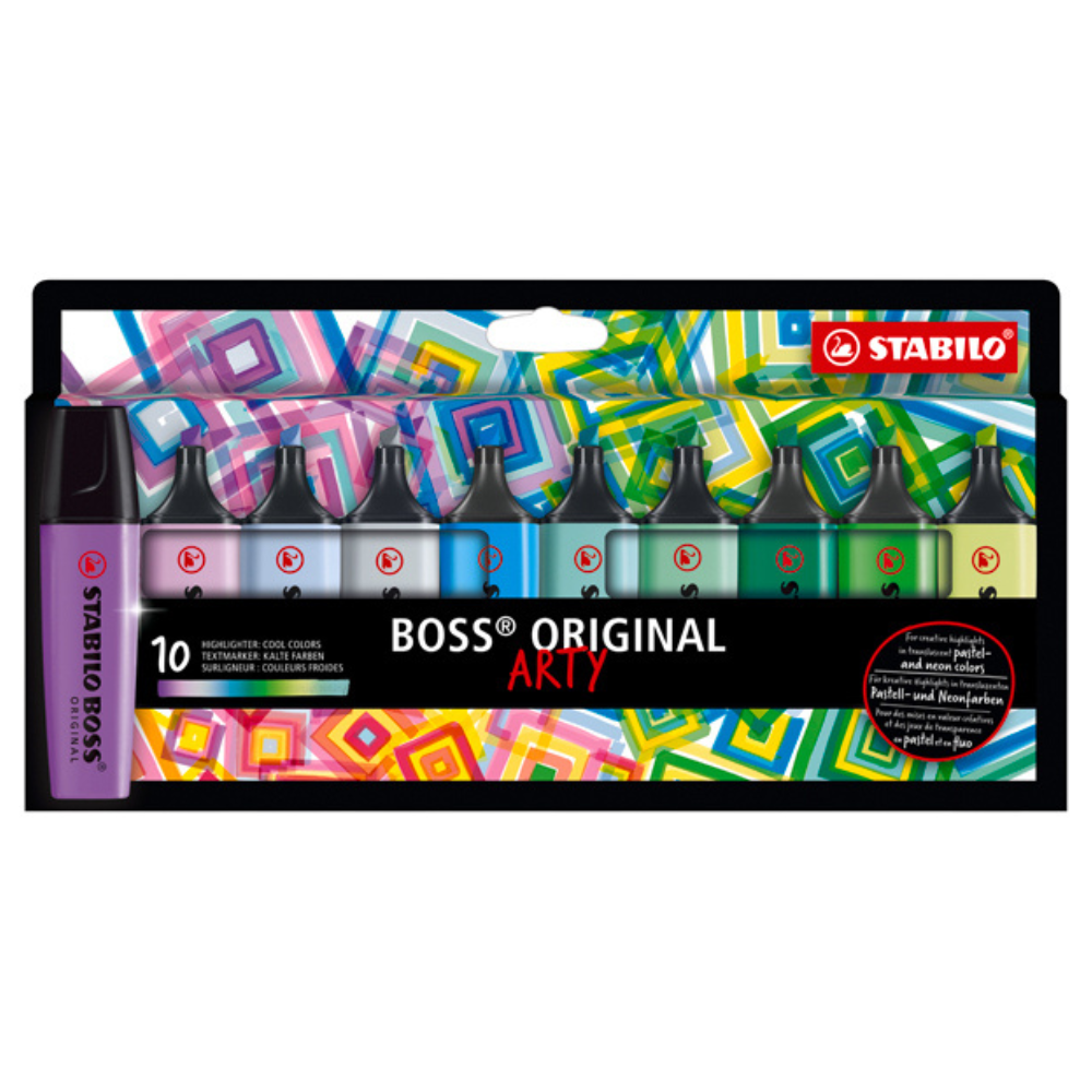 Este set incluye 10 resaltadores Stabilo Boss en tonos fríos (azul, verde, turquesa, lavanda, pastel nube, pastel turquesa, pastel menta, pastel lima, pastel lila y gris polvoriento).