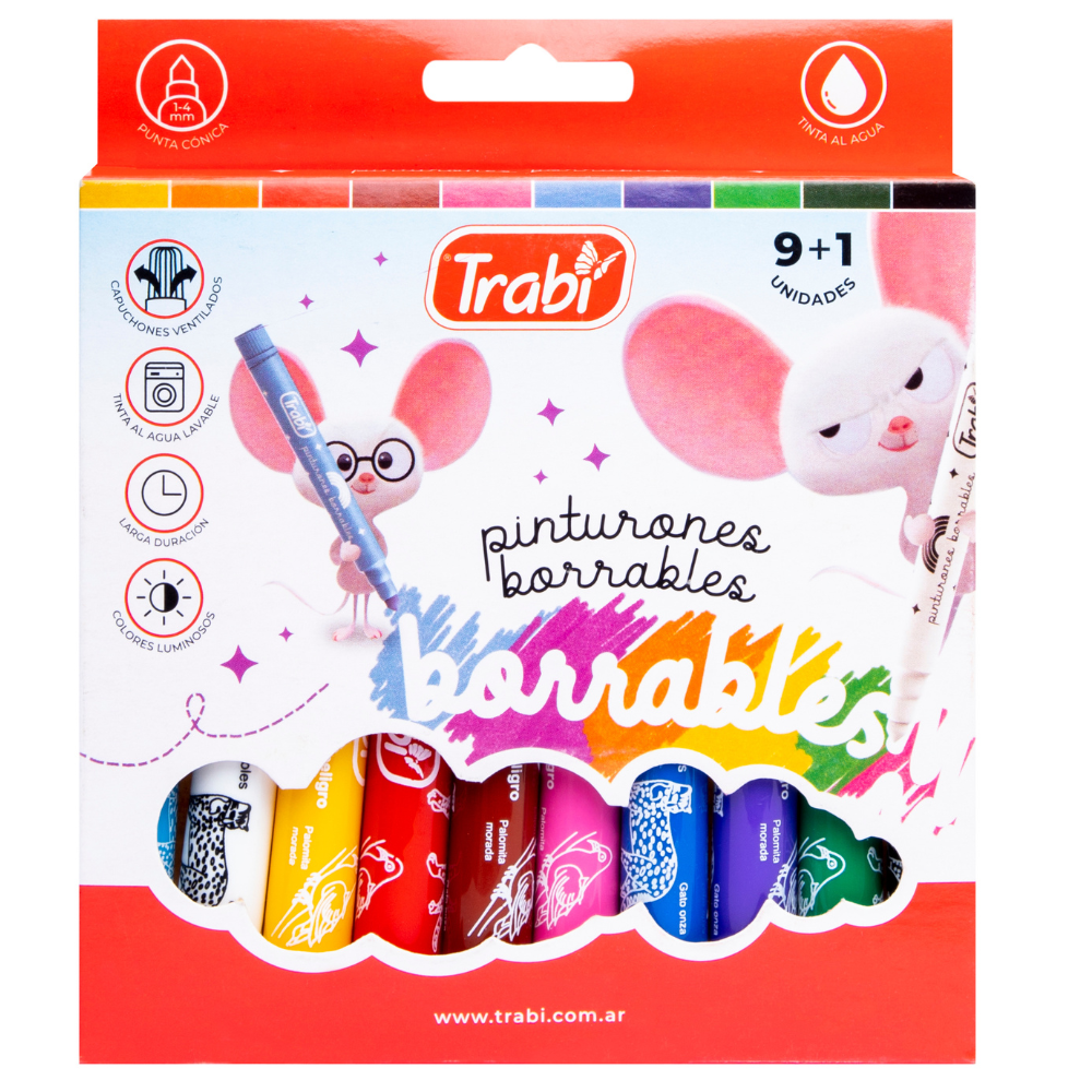 ¡Dale color a tu creatividad con los Marcadores Borrables Trabi Pinturón x 9! 🌈 Estos marcadores son ideales para escribir y dibujar en pizarras, vidrios y superficies no porosas. Con tinta de calidad que se borra fácilmente con un trapo húmedo, podrás hacer y borrar tus ideas sin dejar rastros. 😎✨