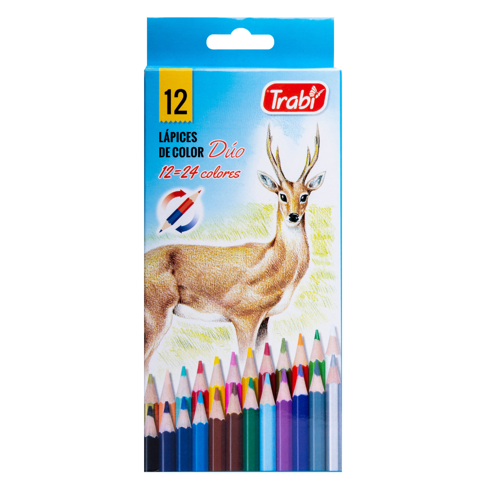 ¡Doble color, doble diversión! 🖍️🌈 Los Lápices de Colores Trabi Doble Punta te ofrecen 24 tonos vibrantes en solo 12 lápices, perfectos para dar rienda suelta a tu creatividad. 💡🎨