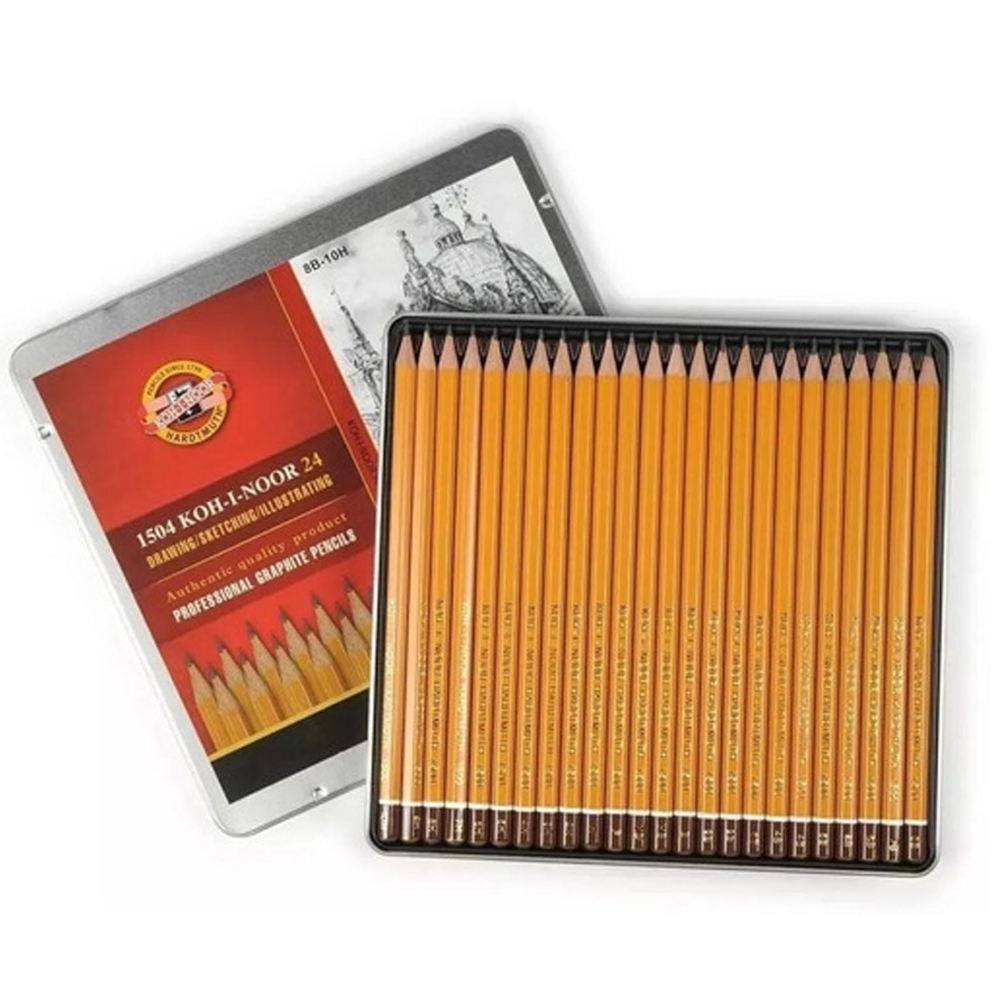 Este set se compone de 24 lápices de grafito, cada uno con una graduación diferente, que van desde 10H a 8B. H F HB HB B 2H 3H 4H 5H 6H 7H 8H 9H 10H 2B 2B 3B 4B 4B 5B 6B 6B 7B 8B. Esta amplia gama de durezas permite utilizar lápices para una variedad de aplicaciones, desde dibujos técnicos hasta bocetos artísticos.